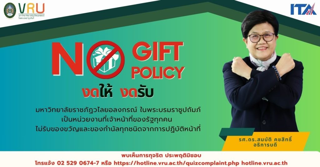 มหาวิทยาลัยราชภัฏวไลยอลงกรณ์ ในพระบรมราชูปถัมภ์ ประกาศนโยบาย “ไม่รับและไม่มอบของขวัญและของกำนัลหรือประโยชน์ใดจากการปฏิบัติหน้าที่” (No Gift Policy) ประจำปีงบประมาณ พ.ศ. 2569 เพื่อส่งเสริมวัฒนธรรมองค์กรแห่งความสุจริต โปร่งใส และป้องกันการทุจริตในทุกระดับ ตามหลักธรรมาภิบาลของมหาวิทยาลัย