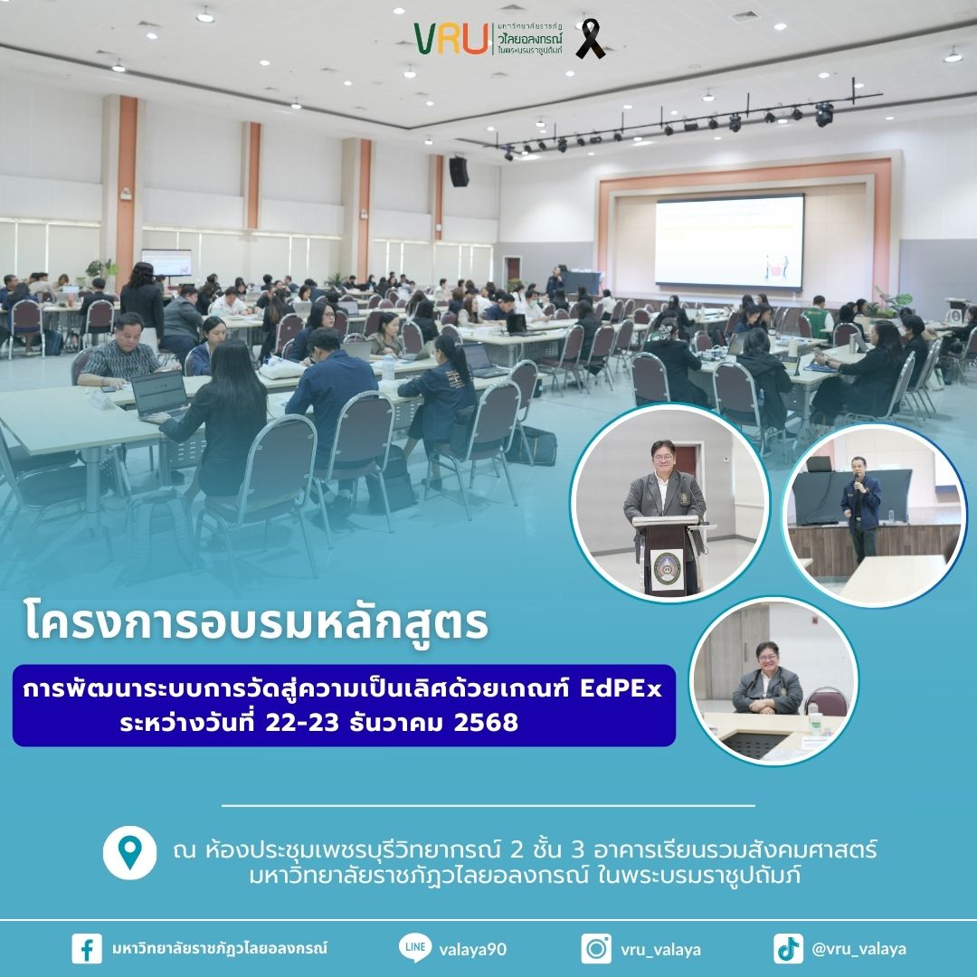 วันที่ 22 ธันวาคม 2568 ผศ.ดร.ปัณณ์รภัส ถกลภักดี รองอธิการบดีเป็นประธาน โครงการอบรมหลักสูตรการพัฒนาระบบการวัดสู่ความเป็นเลิศด้วยเกณฑ์ EdPEx ระหว่างวันที่ 22-23 ธันวาคม 2568 ณ ห้องประชุมเพชรบุรีวิทยากรณ์ 2 ชั้น 3 อาคารเรียนรวมสังคมศาสตร์ มหาวิทยาลัยราชภัฏวไลยอลงกรณ์ ในพระบรมราชูปถัมภ์