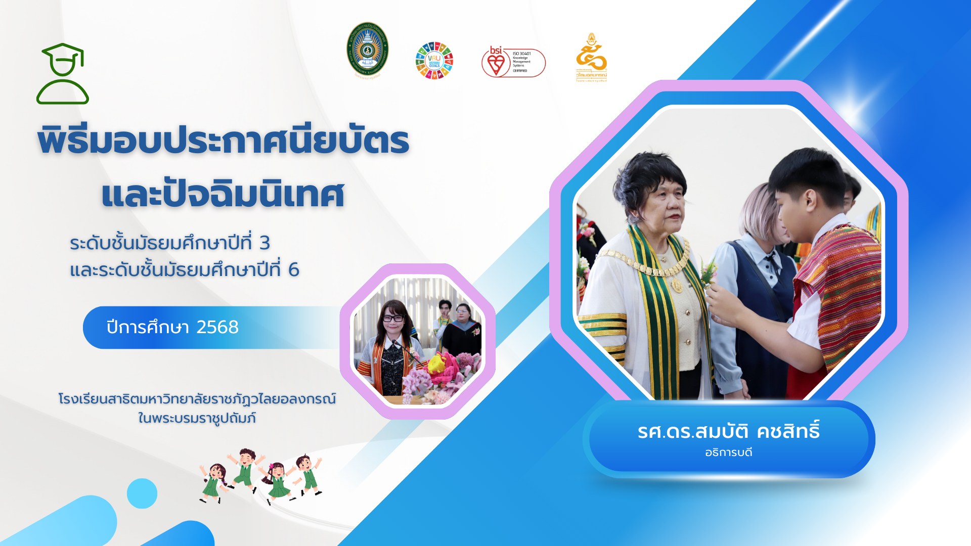 วันที่ 10 มีนาคม 2569 รศ.ดร.สมบัติ คชสิทธิ์ อธิการบดี ประธานพิธีมอบประกาศนียบัตรและปัจฉิมนิเทศ ระดับชั้นมัธยมศึกษาปีที่ 3 และระดับชั้นมัธยมศึกษาปีที่ 6 ปีการศึกษา 2568 โรงเรียนสาธิตมหาวิทยาลัยราชภัฏวไลยอลงกรณ์ ในพระบรมราชูปถัมภ์
