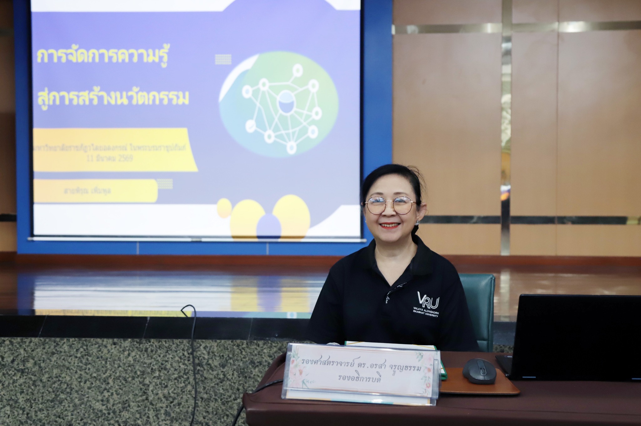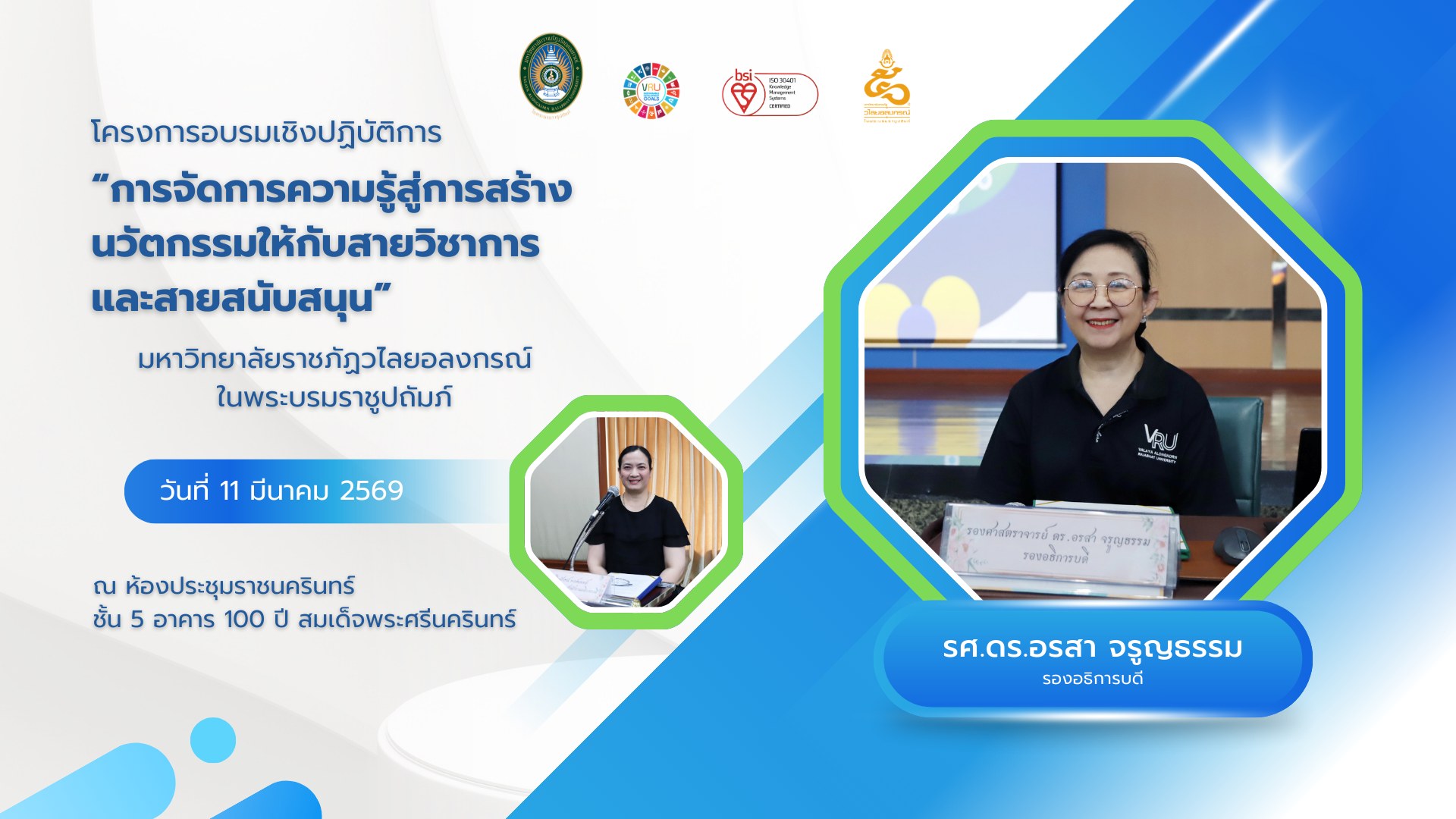 วันที่ 11 มีนาคม 2569 รศ.ดร.อรสา จรูญธรรม รองอธิการบดี ประธานกล่าวเปิดโครงการอบรมเชิงปฏิบัติการ “การจัดการความรู้สู่การสร้างนวัตกรรมให้กับสายวิชาการ และสายสนับสนุน” มหาวิทยาลัยราชภัฏวไลยอลงกรณ์ ในพระบรมราชูปถัมภ์ ณ ห้องประชุมราชนครินทร์ ชั้น 5 อาคาร 100 ปี สมเด็จพระศรีนครินทร์